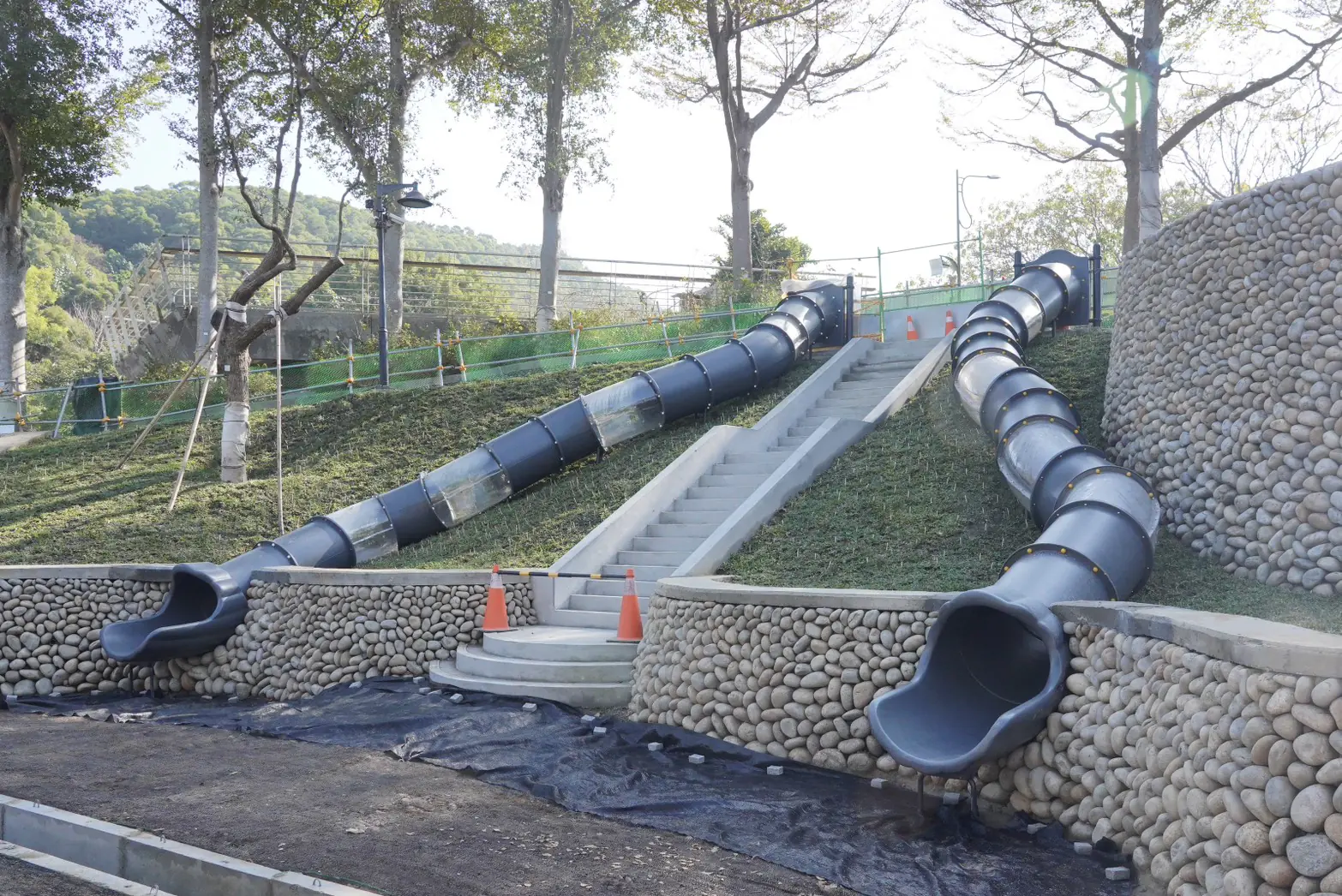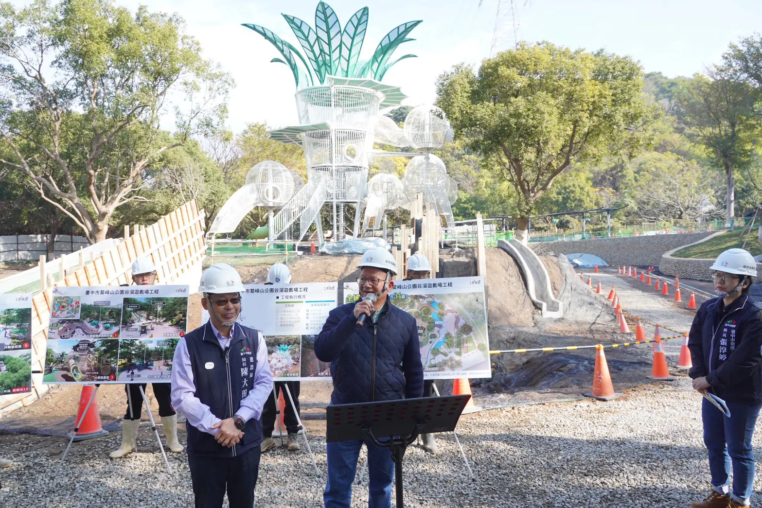 建設局補充,考量基地位處坡地環境,工程規劃初期將水土保持與排水系統列為重點工項,目前相關設施均已完成,可有效提升邊坡穩定與排水效能。另遊戲場亮點大樹遊戲塔亦近完成,後續將依序進行滾輪溜滑梯及相關遊具安裝作業,並同步辦理地坪鋪面等土建工程,逐步完善整體遊戲場機能與使用安全。後續施工將嚴格控管施工品質與安裝精度,並加強工區分流與安全防護措施,確保工程進度穩定推進,為後續啟用奠定良好基礎。