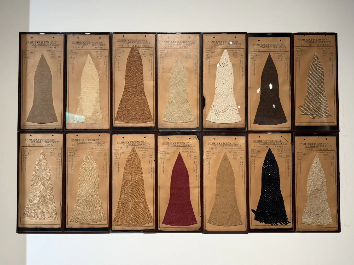草帽不僅是遮陽工具,更是上流社會的時尚標誌。台中市纖維工藝博物館於2樓常設展廳舉辦「草帽王國微型展」,展出由資深帽業出口商李燕山先生捐贈、自1929年起銷往歐美的珍貴帽樣。這批世界唯一的珍貴帽樣,完整記錄百年前的台灣如何以精湛工藝橫掃國際市場,成為僅次於糖與米的第三大出口品,為台灣賺取巨額外匯。