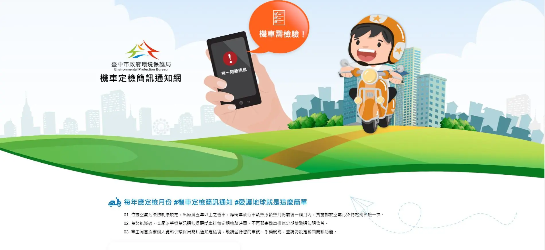 環保局說明,設籍台中市之老舊機車仍有27萬餘輛,佔全市機車總數14%,其中,污染排放量較高之二行程機車近3萬輛,若車輛未能定期執行排氣檢驗,車輛所排放之廢氣將間接影響空氣品質及市民健康。今年度將優先針對未定檢之高污染二行程機車加強管制,請市民朋友務必留意車輛定檢期限,以免受罰。若為設籍本市之民眾可至「台中市政府環境保護局機車定檢簡訊通知網」( https://taichungmotosms.taichung.gov.tw/# ) 完成手機號碼及機車車牌登錄作業,即可於每年機車應定檢期間,收到環保局主動發送之簡訊提醒服務。