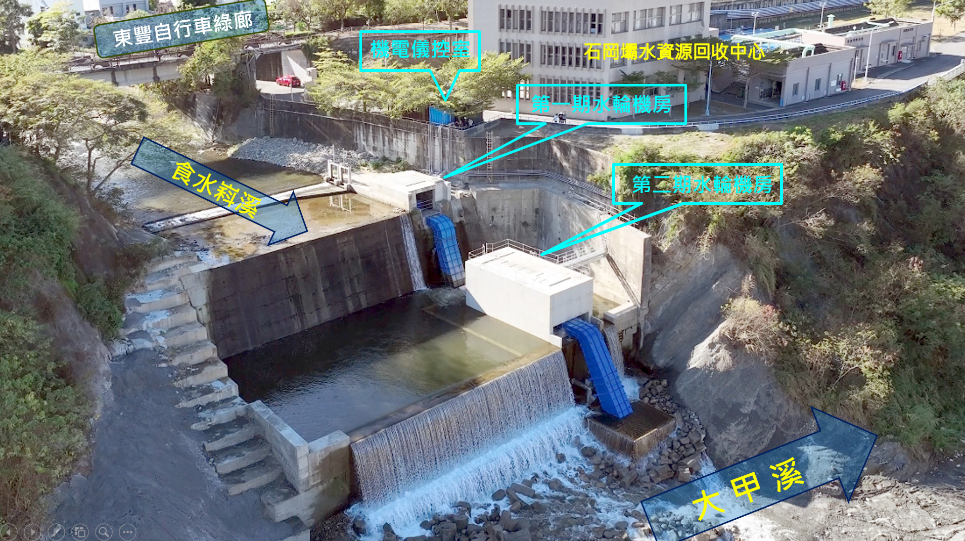 位於台中市石岡區的「食水嵙溪排水小水力發電廠」,是全台首座由地方政府主導推動的發電廠,已於2024年7月正式啟用,市府水利局為進一步提升水資源的利用,在第一期電廠下游跌水工處增設第二期電廠,善用發電尾水實現二次發電願景,二期電廠工程也於2025年12月完工,現正進行機組試運轉作業,為台中市推動再生能源與水資源活化再添新力。