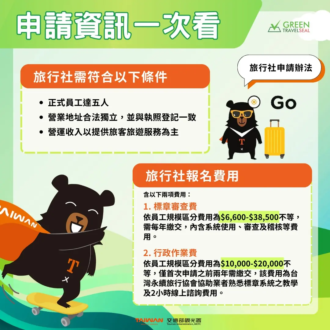 旅行社報名費用如何計算?含以下兩項費用:(1) 標章審查費:依員工規模區分費用為台幣6,600~38,500元不等,需每年繳交,內含系統使用、審查及稽核等費用。(2)行政作業費:依員工規模區分費用為台幣10,000~20,000不等,僅首次申請之前兩年需繳交,該費用為台灣永續旅行協會(GD B.V. 指定台灣標章執行單位)協助業者熟悉標章系統之教學及2小時線上諮詢費用。