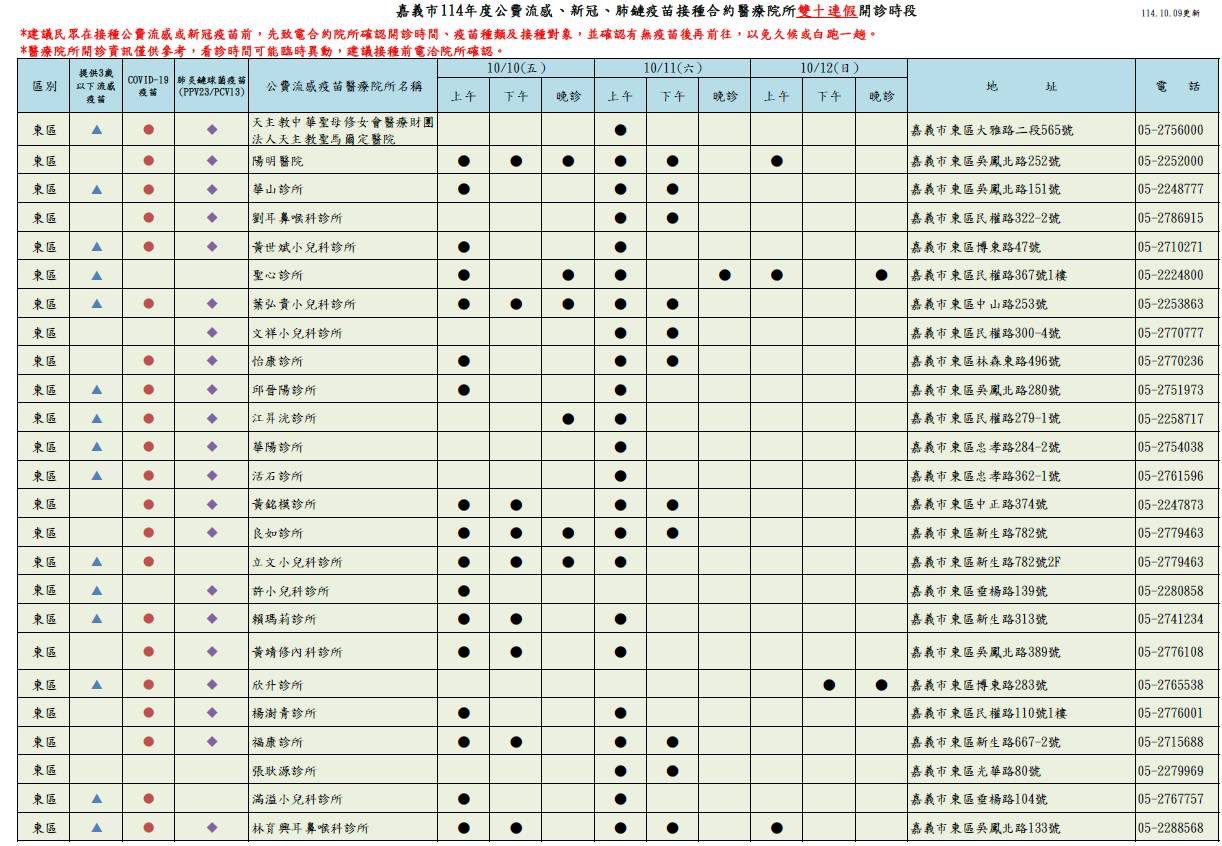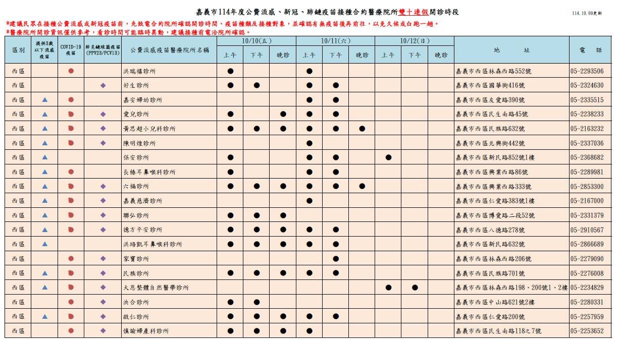 10月10日至12日適逢雙十節連假,嘉義市流感及新冠疫苗接種服務不間斷,共計65間醫療院所提供疫苗接種服務,開診資訊詳如附圖,籲請民眾前往接種前先致電醫療院所確認開診時間、疫苗種類及接種對象。