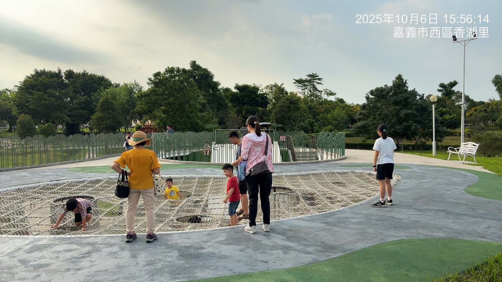 綠豆仁遊戲場設計多元,設施包含上層編織網區,提供彈性空間,鼓勵兒童攀爬、鍛鍊協調力;3公尺長滑梯區,讓孩子們安全滑行,兼具刺激與樂趣;下層共融沙坑區,促進不同年齡層孩童互動、共同遊戲;楓香步道融合自然景觀,成為親子散步與休憩的理想去處;夜間燈光設計則展現「越夜越美」的視覺效果,增添夢幻氛圍,成為夜遊嘉義的新亮點。