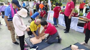 終點會場則熱鬧不減,繁昌社區發展協會與屏東縣觀護協會攜手進行反毒、反暴力、反詐騙宣導,守護社區安全。紅十字會志工團更於現場示範CPR、AED操作及異物哽塞、止血包紮等急救技巧,傳遞健康與人道關懷的正能量。