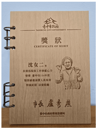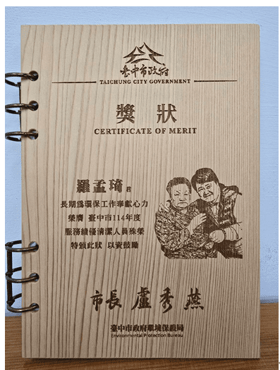 陳局長指出,今年為推廣資源回收永續環保理念,致贈傑出績優隊員採用環保局寶之林所製作檜木筆記本獎狀,獎狀素材取自清潔隊回收的老檜木廢棄家具,封面採以富有紀念性的隊員個人生活照雷刻設計,保有檜木天然香氣與溫潤質感,同時融合傳統工藝與現代設計,兼具文化底蘊與環保精神,也能展現資源循環再利用的永續價值。