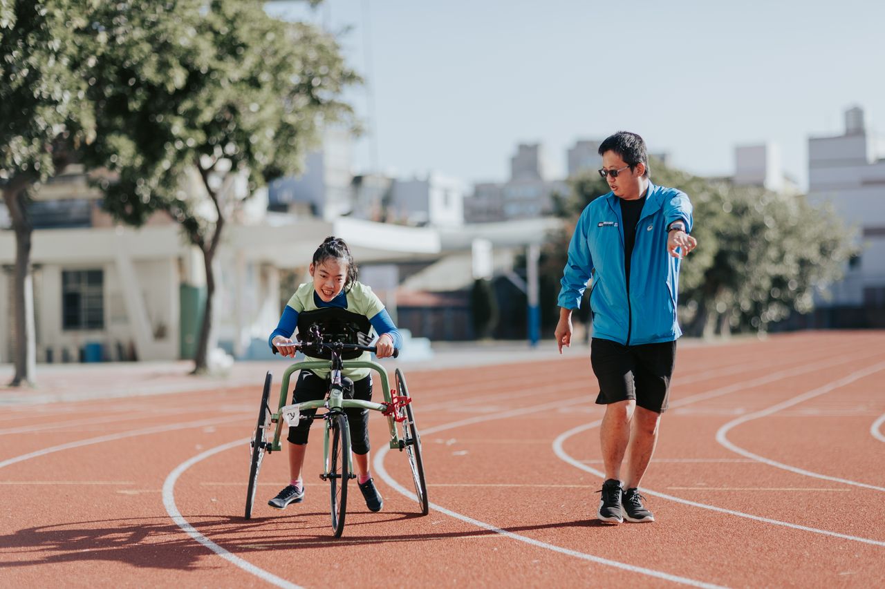 《台灣超人》受訪者「腦麻小太陽」姚宥米(左)接受教練父親姚宗元(右)指導、想要做什麼、不要半途而廢、不管是正在走向放棄自己的路上、還是勇敢跨越自己障礙的路上、都希望盡量不要放棄。 圖片提供:公視