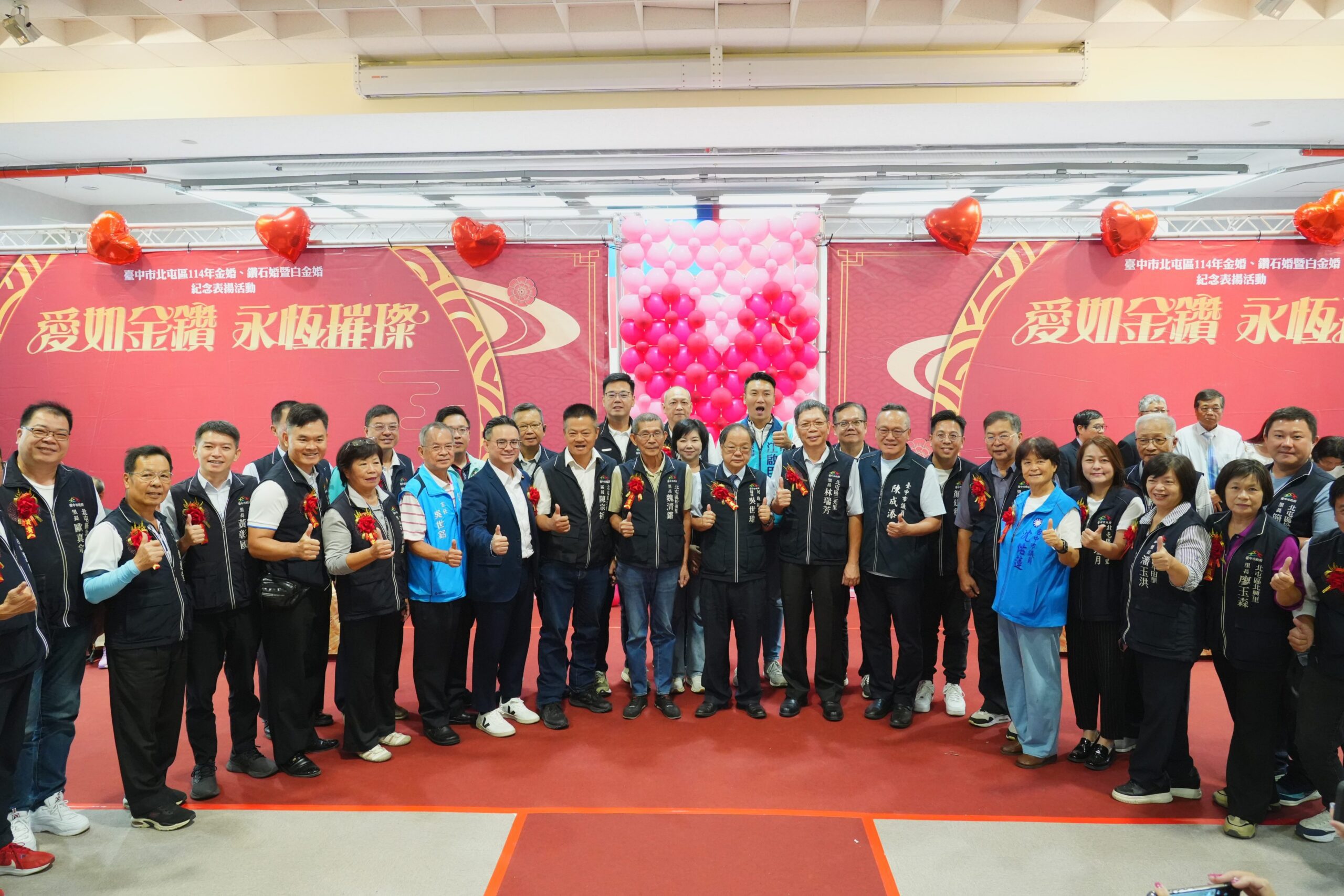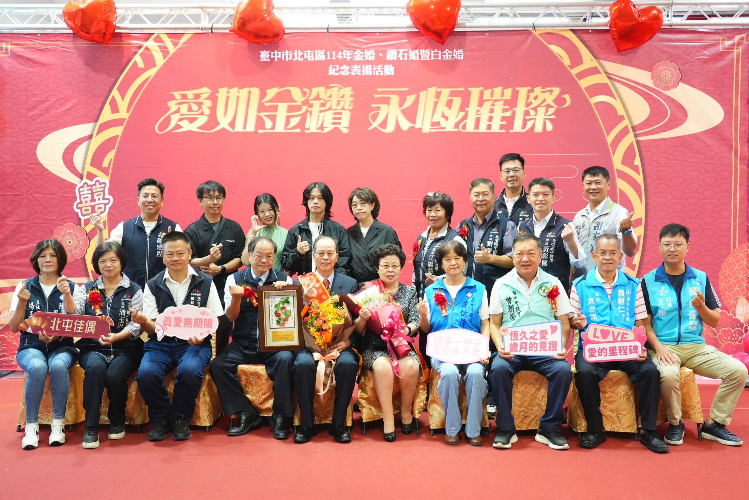 台中市北屯區公所今(24)日在公所六樓禮堂舉辦「114年金婚、鑽石婚暨白金婚紀念表揚活動」,共195對恩愛伉儷接受表揚,包括結婚逾70年的白金婚4對、逾60年的鑽石婚45對,以及逾50年的金婚146對,上百對恩愛佳偶在親友陪同下歡喜出席,現場洋溢幸福氛圍。民政局長吳世瑋代表市長盧秀燕頒發紀念獎牌,讚揚銀髮佳偶相互扶持、情深不渝的愛情典範,並祝福所有市民都能攜手共度幸福美滿人生。