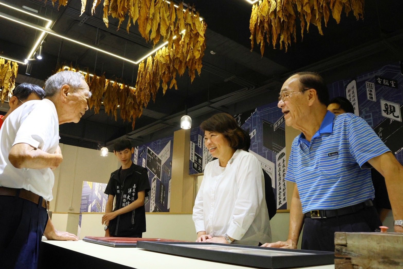 黃敏惠表示,很高興今日與多位嘉菸廠的資深員工一同返回嘉義菸葉廠禮堂,聽著他們細數過往的工作點滴,彷彿打開時光膠囊,重溫了那段屬於嘉菸的歷史時光。「北松菸、南嘉菸」,嘉菸廠曾是台灣發展菸業時的重鎮,對於國家經濟發展有著重要的地位與貢獻,也帶動了嘉義市的經濟成長,在舊嘉義菸葉廠即將轉型為嘉義市區域設計中心之際,市府透過展覽讓更多世代的人了解這座廠區過去歷史,也連結世代記憶,帶著學生一同走進展場,讓文化扎根鼓勵孩子「帶著一雙來自未來的眼睛,去到遙遠的過去,做著當下的探索」,奠基歷史、更穩健的走向未來。