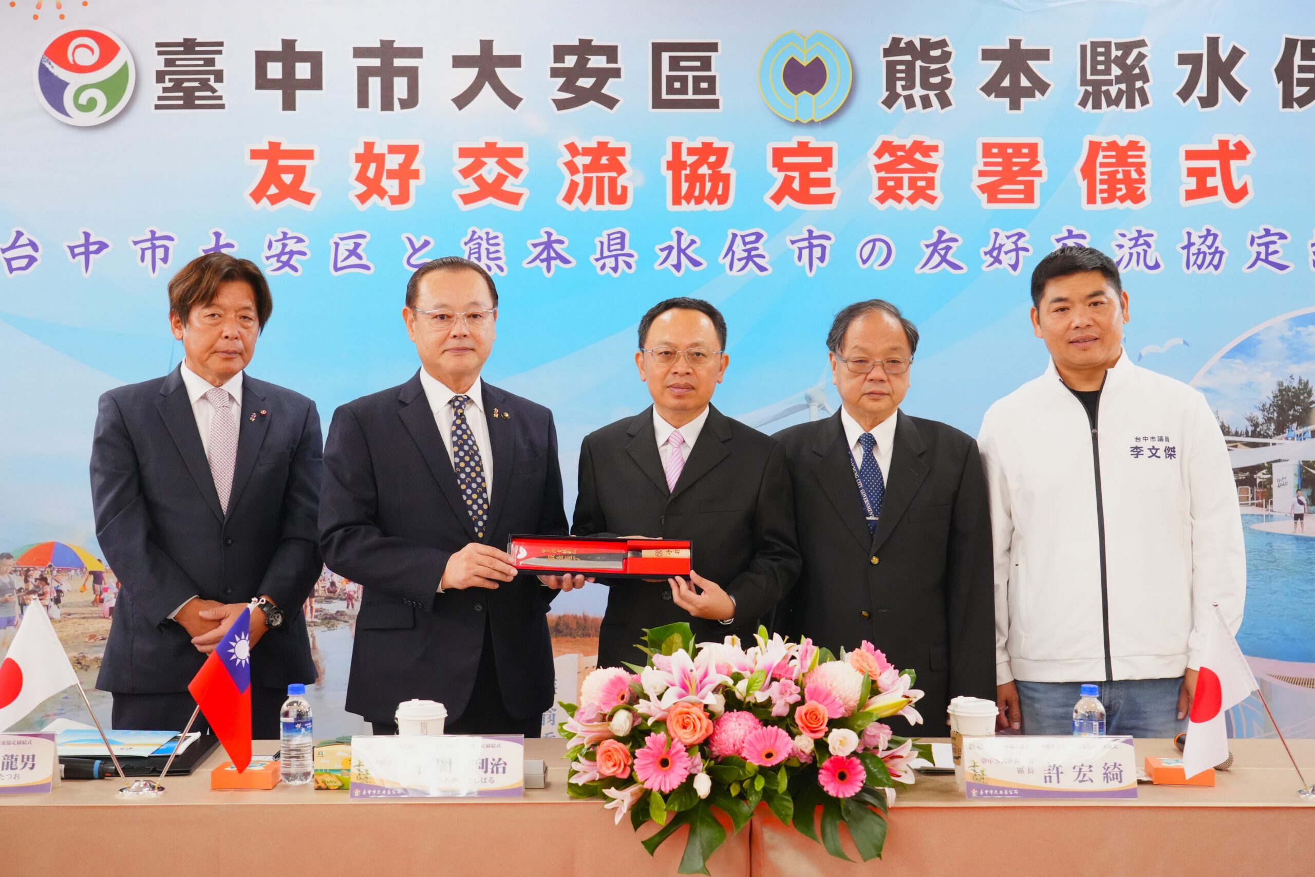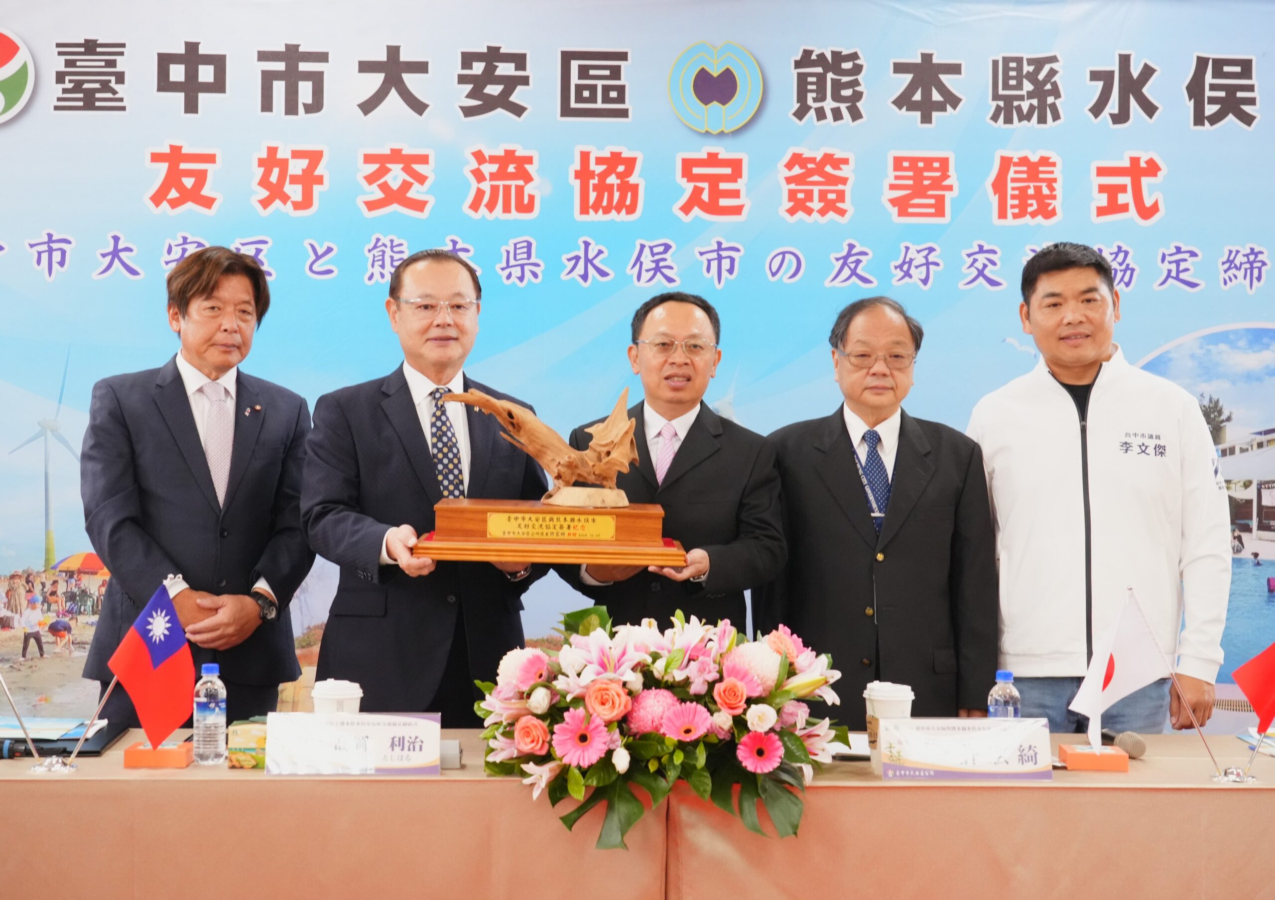台中市大安區長許宏綺表示,大安區位於台中市西北部濱海地區,近年持續推進硬體建設、交通規劃及公園綠地等公共設施,積極提升市民生活品質。觀光方面,大安海岸線遼闊平坦,是民眾夏日休閒戲水的熱門景點;體育方面,區公所長期推廣太極拳、籃球等全民運動,鼓勵市民強健體魄、凝聚向心力。此次與水俣市締結友好城市關係,雙方將在體育、觀光、文化教育等領域展開交流合作,共同開拓多元合作機會,為地方繁榮及永續發展注入新活力,並進一步深化台日友誼。