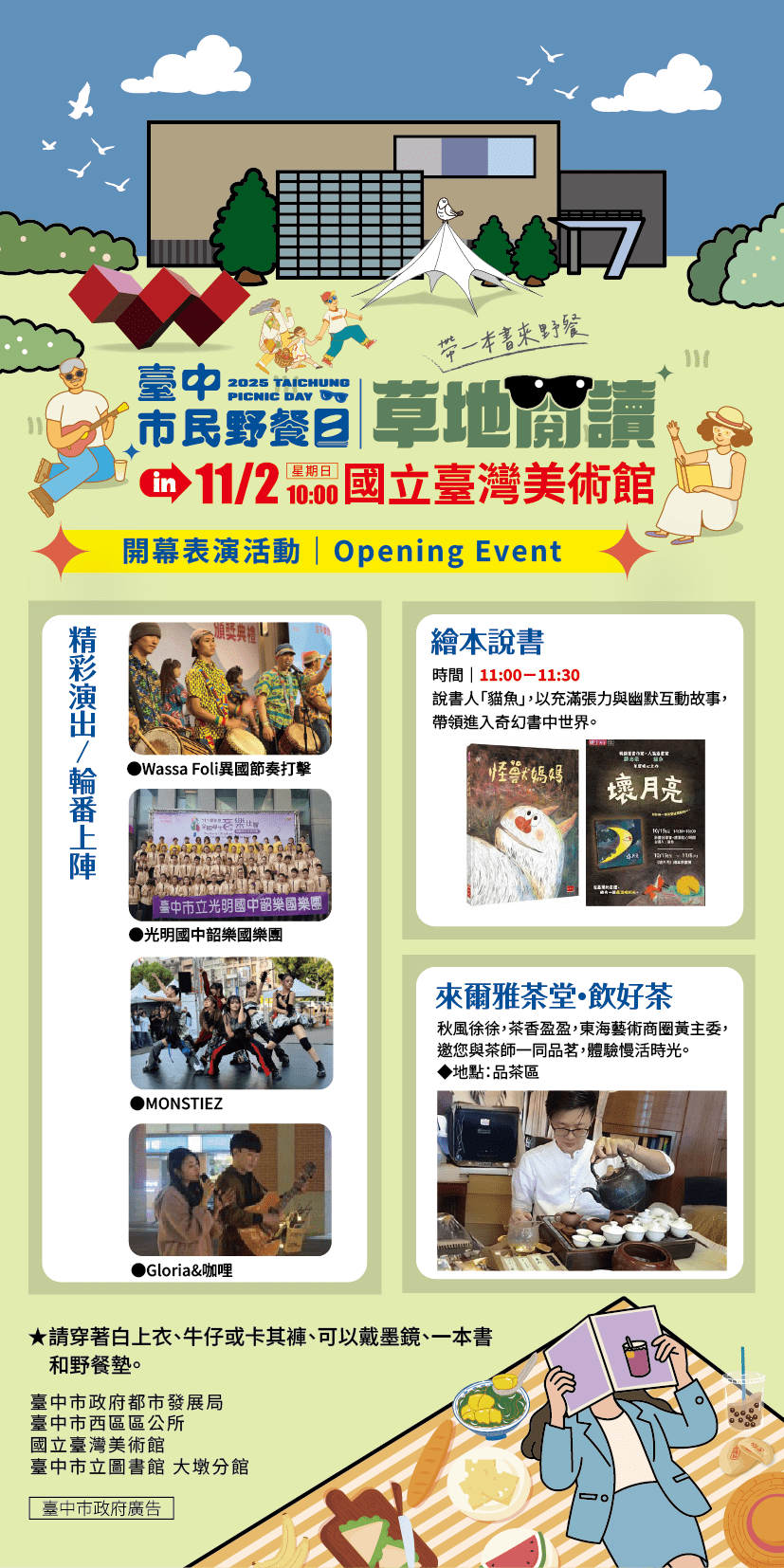 當日活動特別邀請草地閱讀說書人「貓魚」故事秀、異國風味打擊表演團隊Wassa Foli、西區在地光明國中韶樂國樂團、一中街舞比賽冠軍隊伍,以及音樂人Gloria&咖哩的現場演唱,還有彩繪公仔DIY教學,可說是說、學、逗、唱樣樣兼具,精彩可期,讓市民徜徉在悠閒愜意的週日藝文氛圍中;同時為響應綠色生活理念,倡導「綠色無痕野餐」,都發局誠摯邀請市民自備餐具、陽傘、可重複使用的野餐墊,並落實垃圾分類與資源回收,以行動實踐永續生活美學。