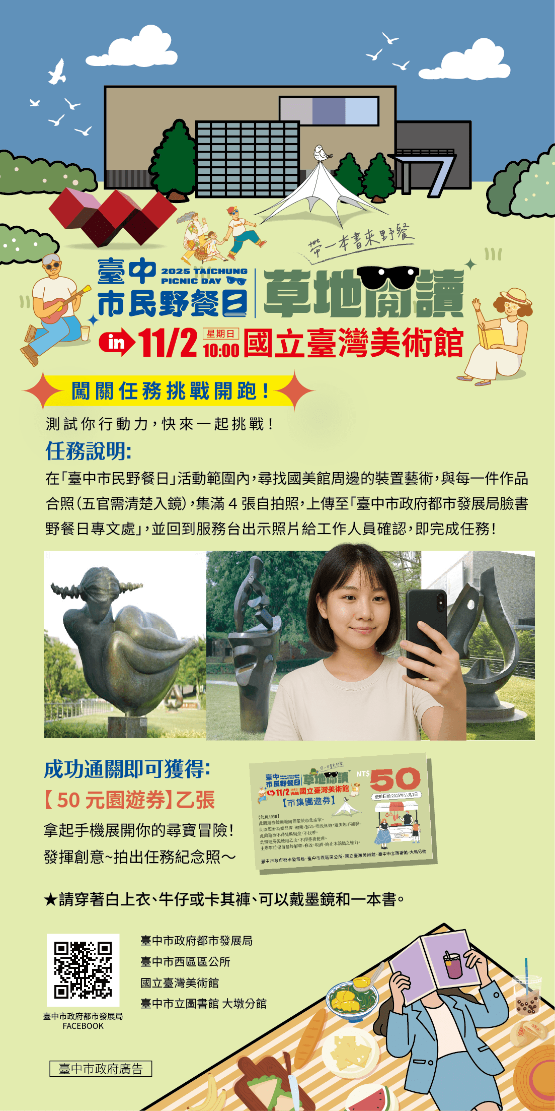 都發局表示,「台中市民野餐日」不僅是一場結合閱讀與休閒的文化盛會,更是展現城市綠地與公共空間多元魅力的絕佳機會,誠摯邀請市民於11月2日攜家帶眷,一同在草地上閱讀、聆聽、分享,享受屬於台中的秋日時光。
