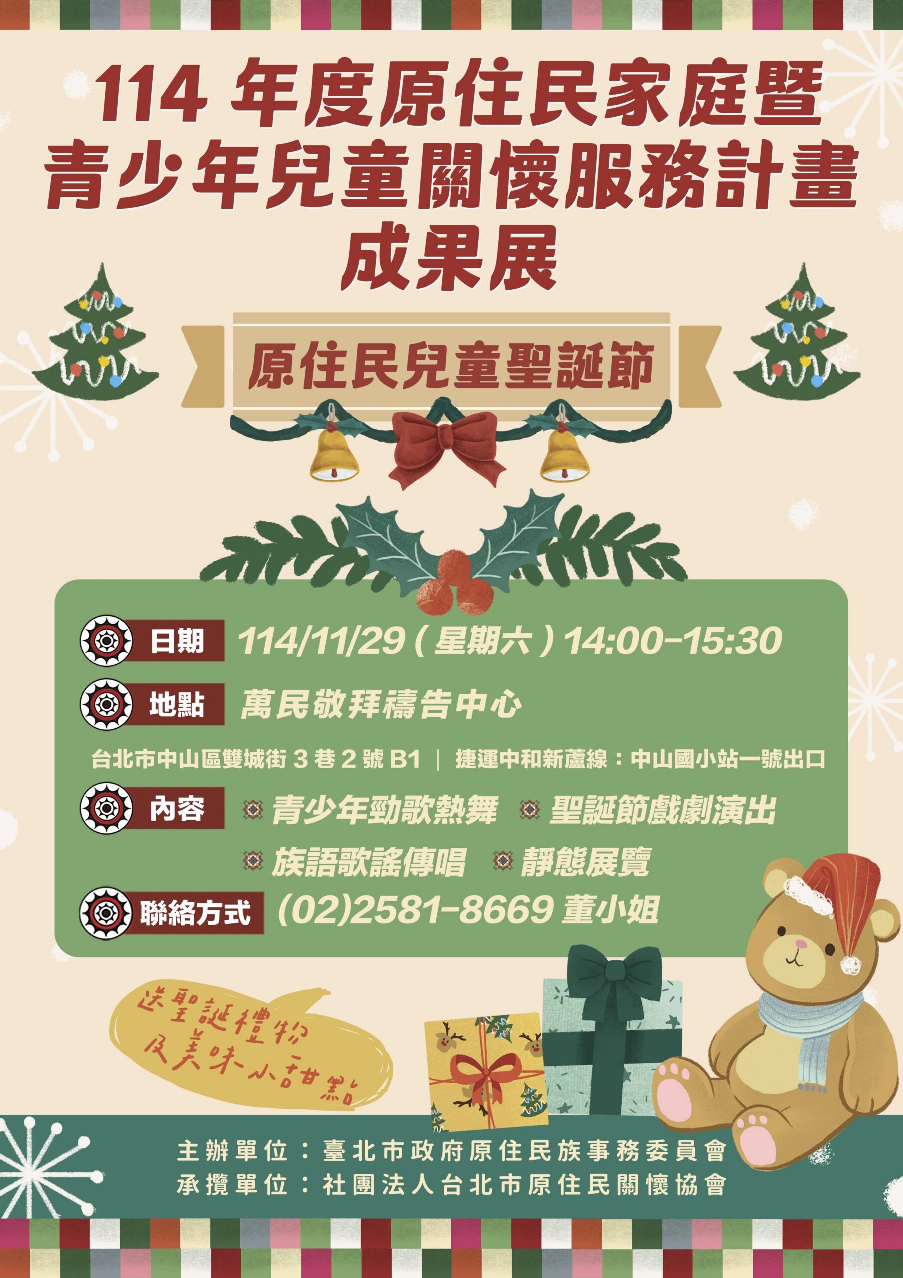 臺北市政府原住民族事務委員會將於11月29日在臺北市萬民敬拜禱告中心舉辦「114年度臺北市原住民家庭暨青少年兒童關懷服務成果展」。活動內容包含勁歌熱舞、樂團演出、族語歌謠傳唱、戲劇表演及靜態作品展示,全面展現孩子們一年來的學習成果與生命成長。現場也將特別表揚表現優異的學生,肯定他們在學業、才藝與品格上的努力與突破,見證孩子們在課後照顧陪伴下的茁壯與自信。