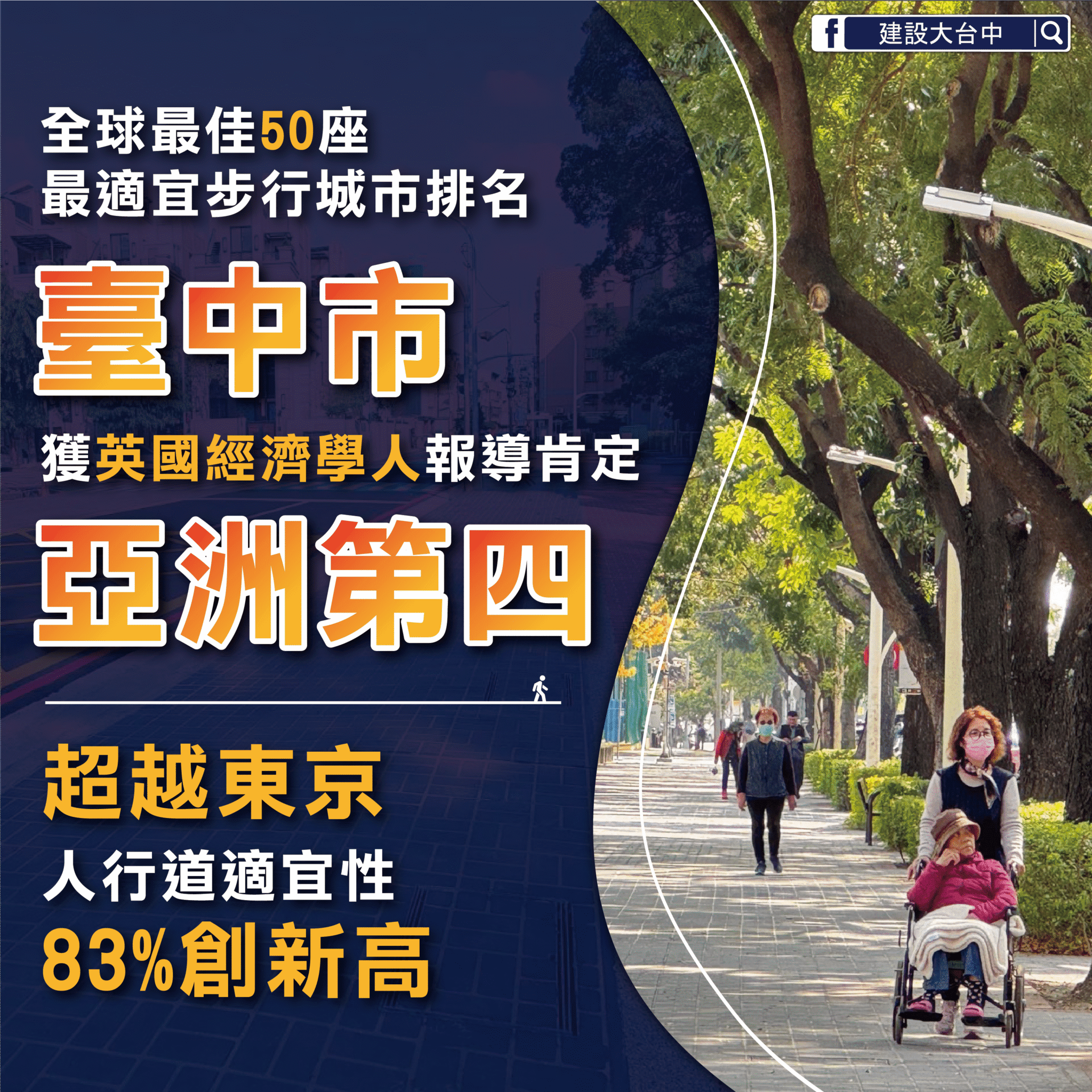 臺中市在2025年英國《經濟學人》研究中獲評為全球步行友好城市第49名、亞洲第4名