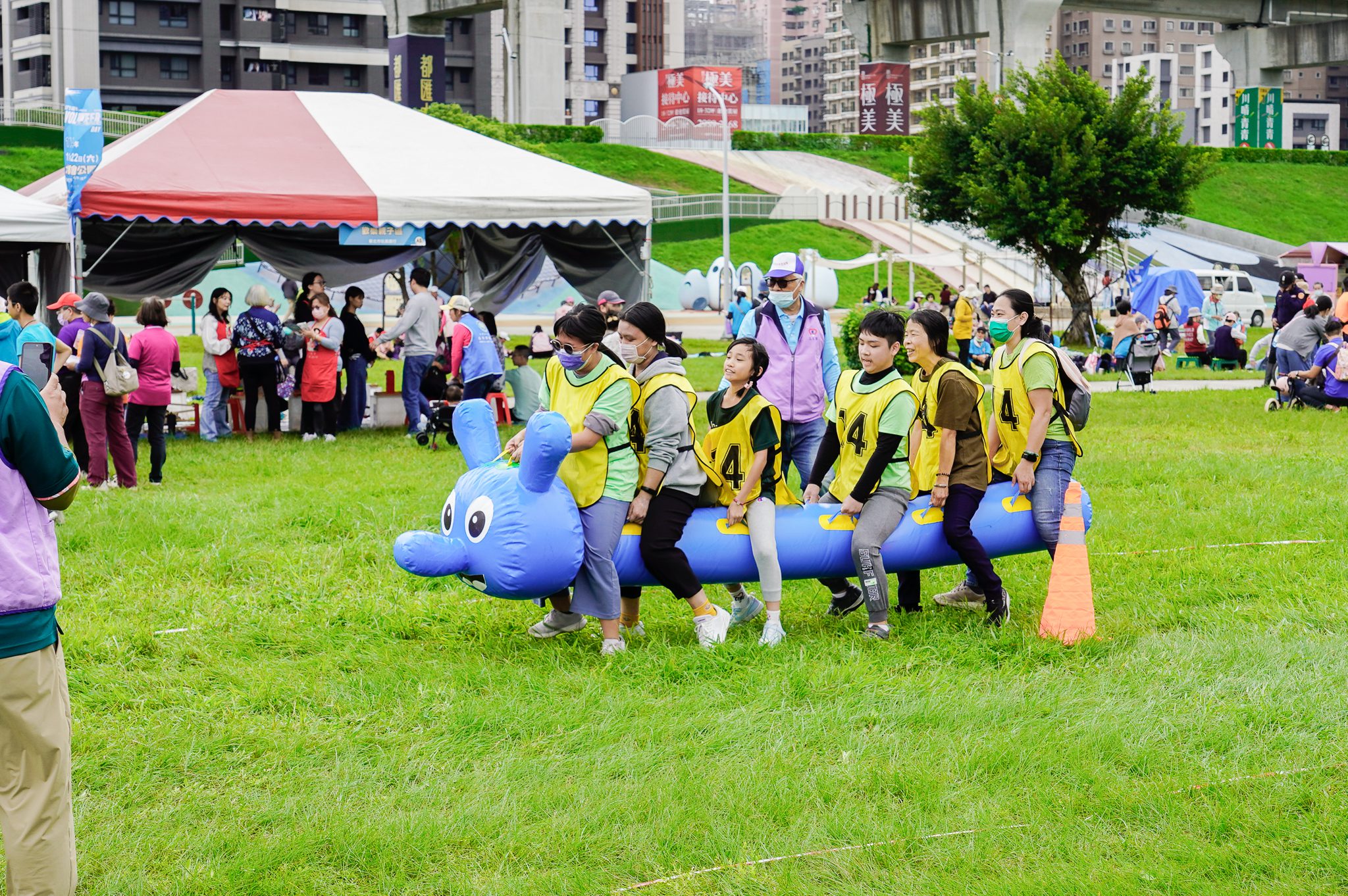 新北團體志工參與趣味闖關任務,笑聲不斷。(新北市社會局提供)