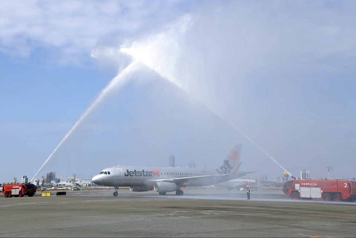 圖説:捷星航空接受首航之禮。(捷星航空提供)