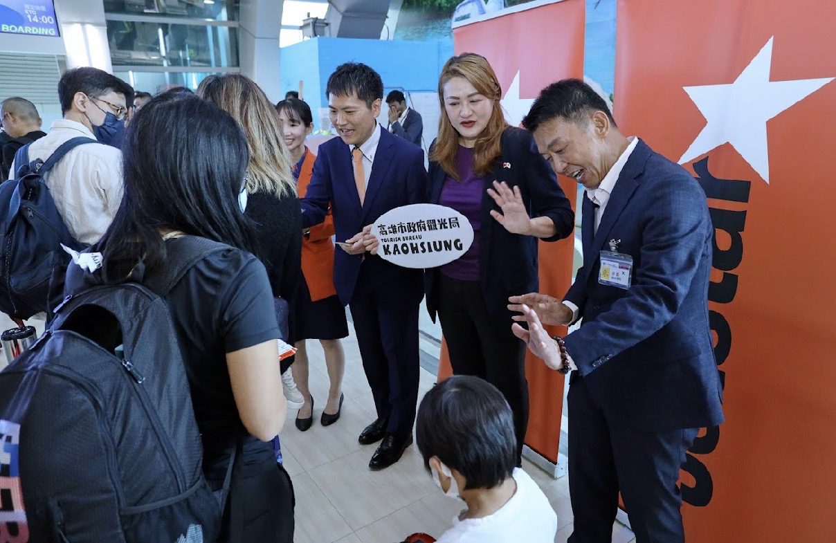 圖説:市長陳其邁及觀光局長高閔玲,送行首航搭機乘客。(捷星航空提供)